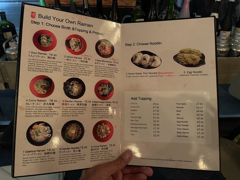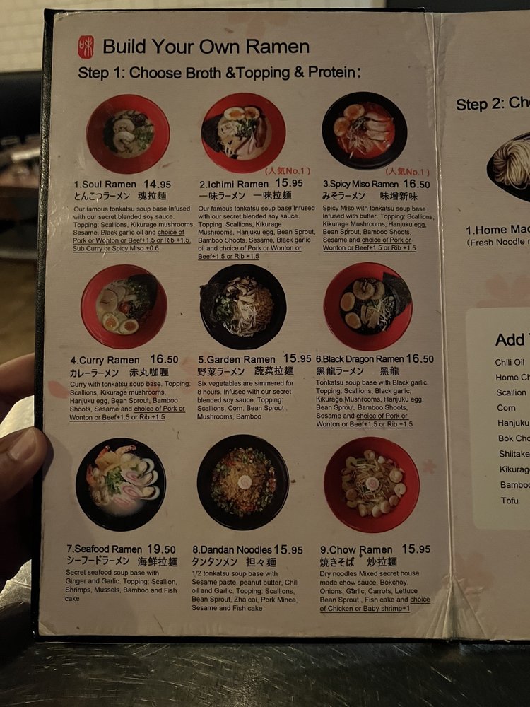 Tonkatsu soup base with pepper and black garlic. Toppings: scallions, black garlic, kikurage mushrooms, hanjuku egg, bean sprouts, bamboo shoots and choice of side.